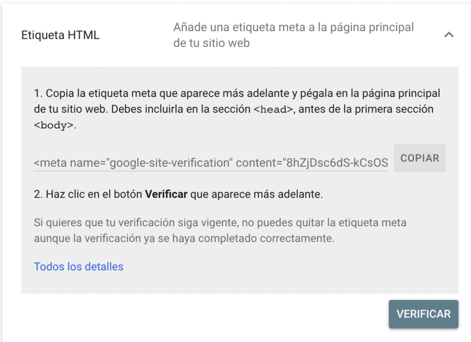 - Copia el código de verificación HTML.