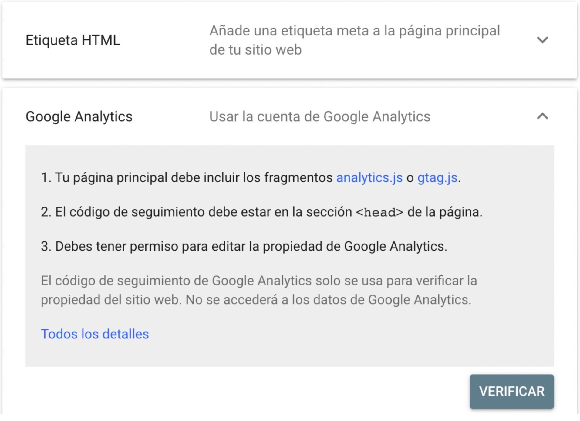 - Verificación con Google analytics (Recomendada si ya estás midiendo con una cuenta de Google Analytic. Es inmediata).