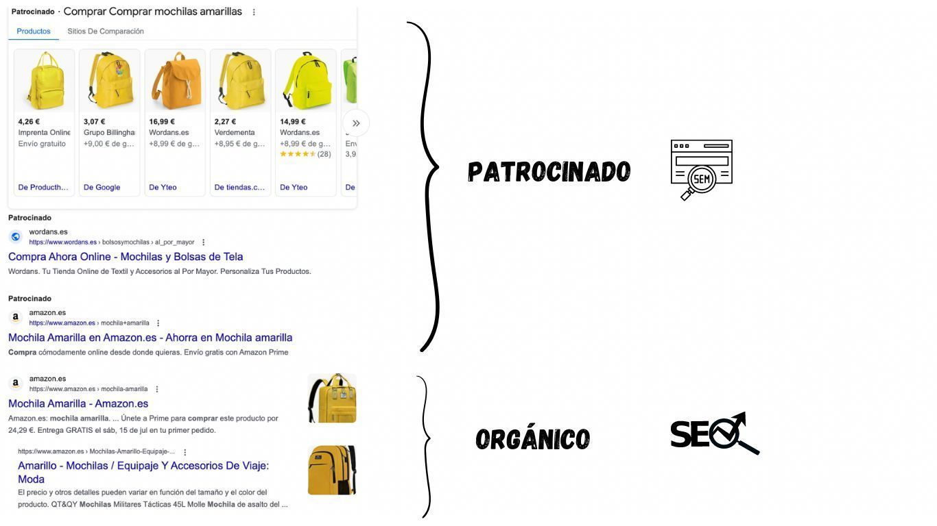 o “gratis”, pues si ahora mismo realizas una búsqueda comercial en Google, por ejemplo: “comprar mochila amarilla”, verás que algunos resultados tienen la